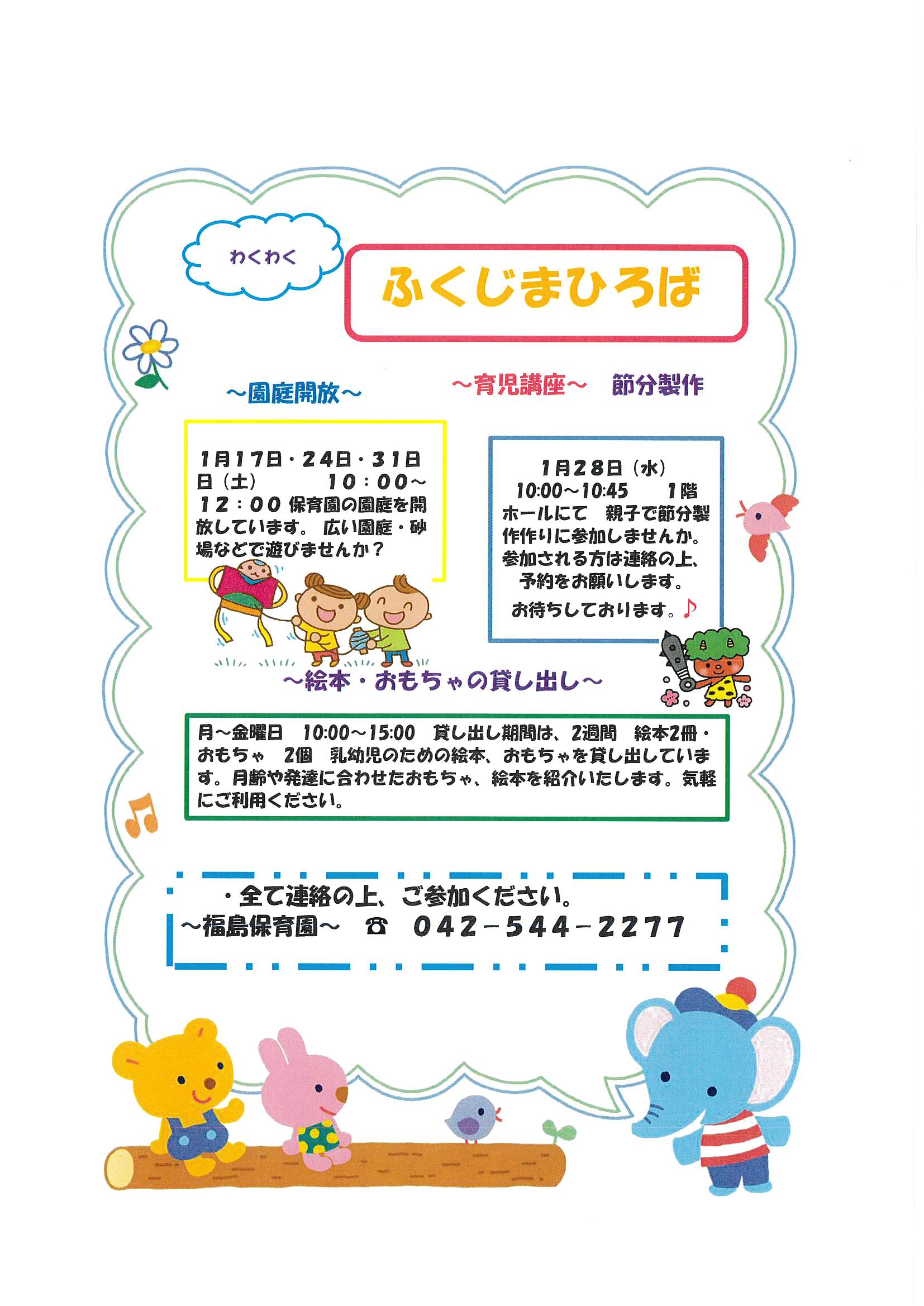 わくわく ふくじまひろばを毎月開催しております。親子で一緒に楽しい時間を過ごしていただけたらと思います。お会いできることを楽しみにしております。福島保育園本園に連絡の上、ご参加ください。