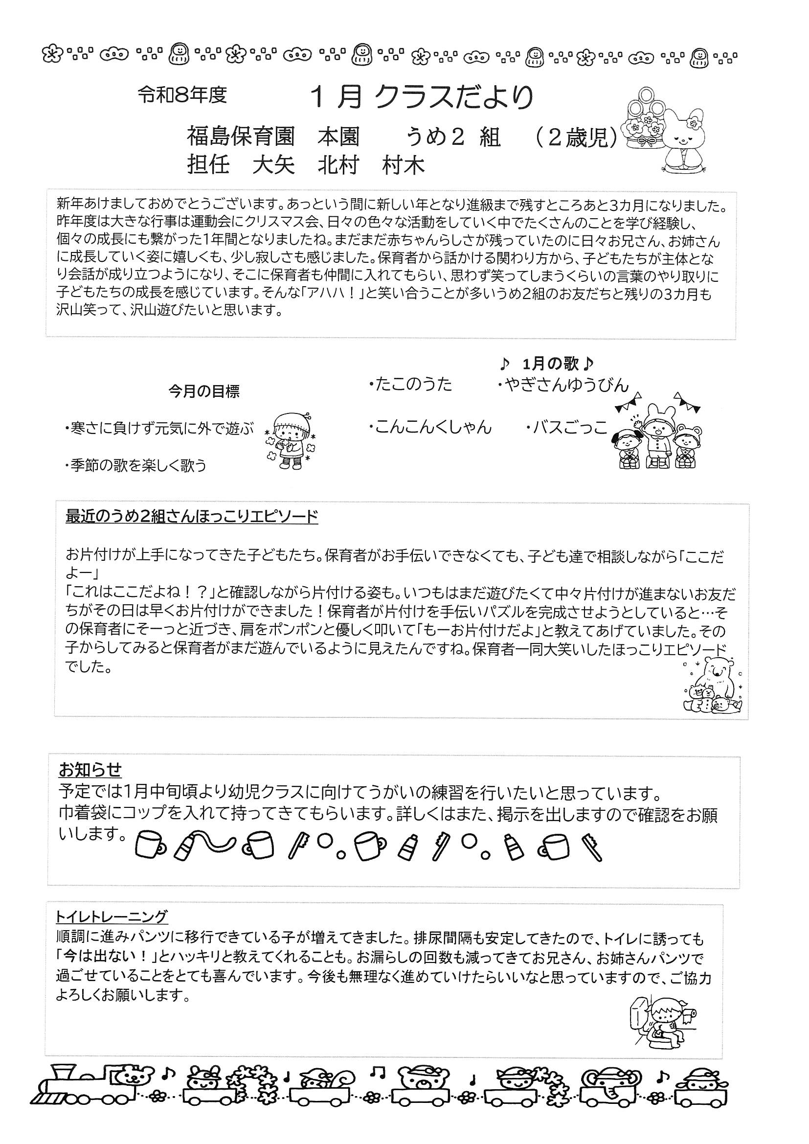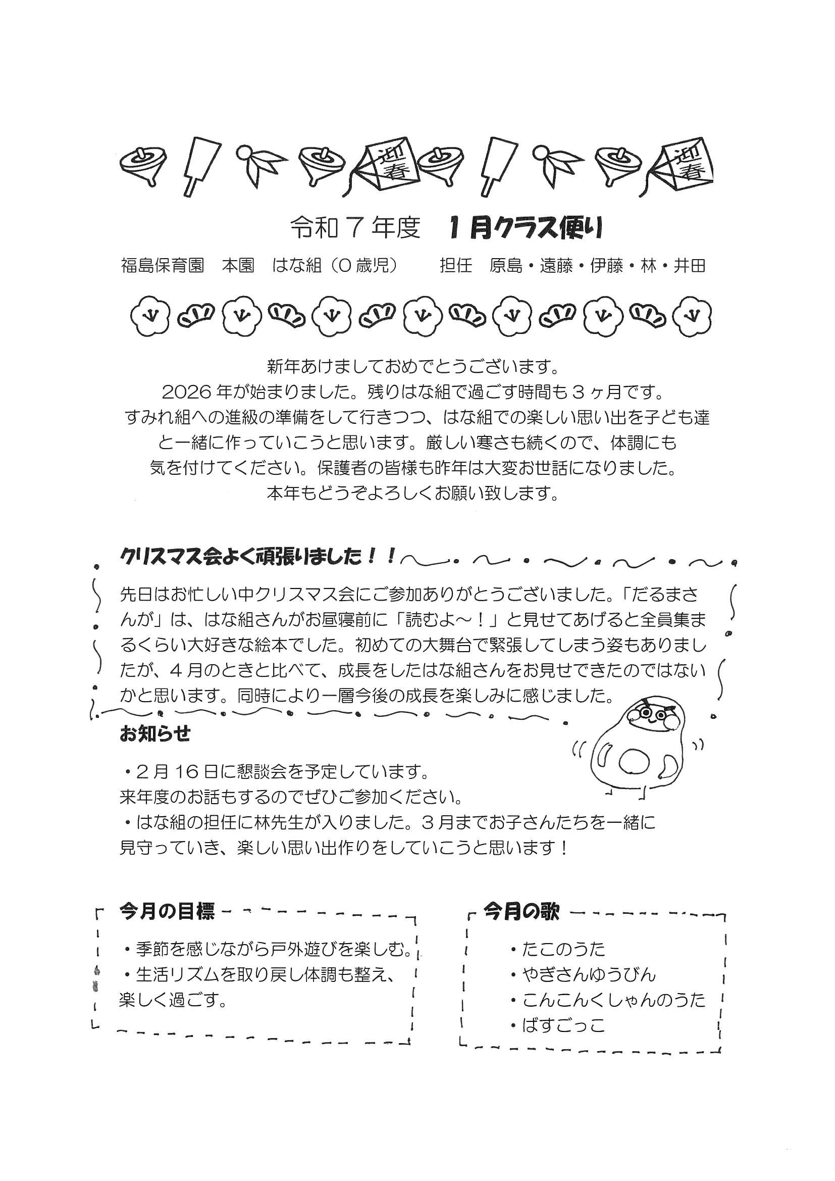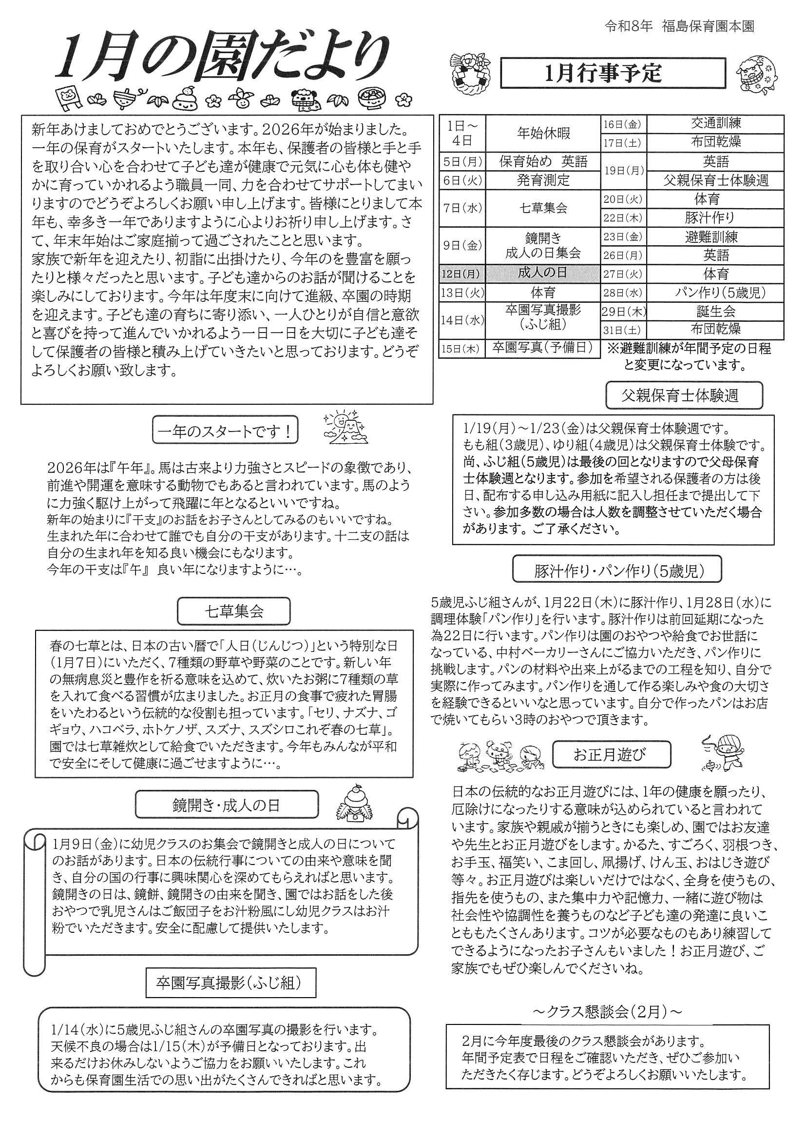 新年あけましておめでとうございます。2026年が始まりました。新しい年の幕明けです。今日から保育始め。子ども達の元気な声が響き渡り、新年の挨拶をしました。今年はどんな一年になるでしょうか。子ども達、保護者の皆様、職員が今年も健康で元気に幸せな一年が送れますように…。お祈りいたします。