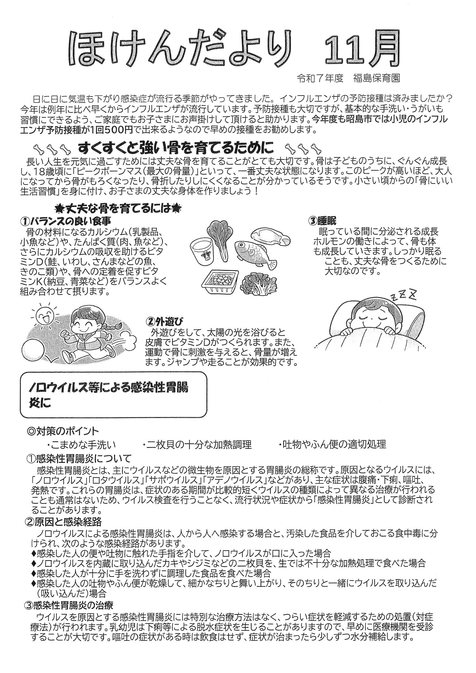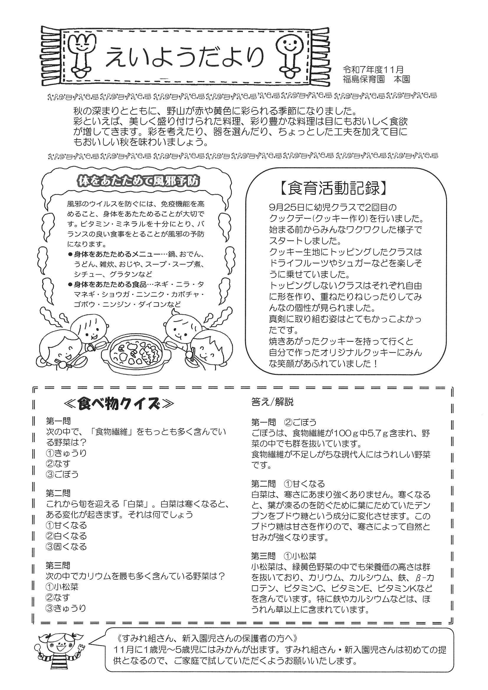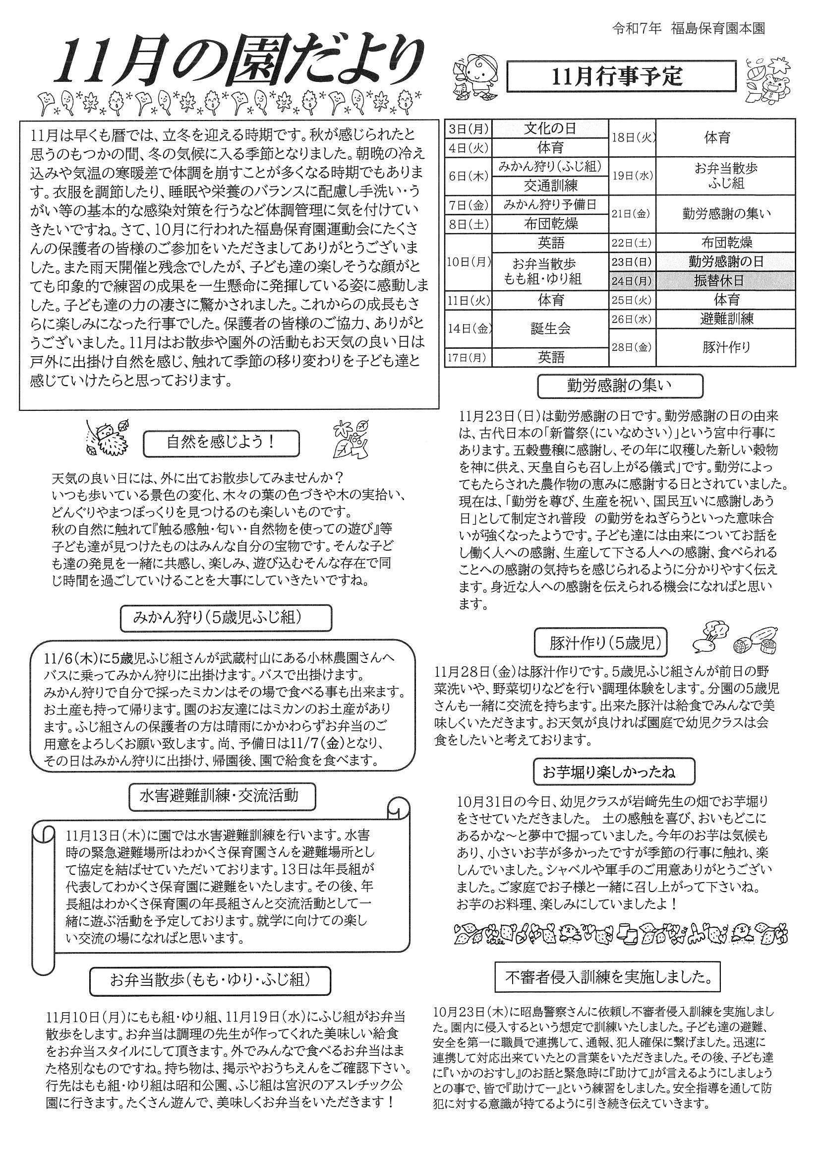 朝晩はグッと気温が下がり、上着がないと寒さを感じるようになりました。いよいよ冬に近づいていきますね。体調管理には十分気をつけたいものです。日中は暖かくて、子ども達は戸外に出掛け散歩を楽しんだり、園庭で身体をたくさん動かして汗ばむくらい元気いっぱいに過ごしています。小さいお友達も歩く距離が長くなりずいぶん遠くまで歩けるようになりました。気持ちの良いお天気の日には戸外に出掛け、自然に触れて秋を満喫したいと思っています。